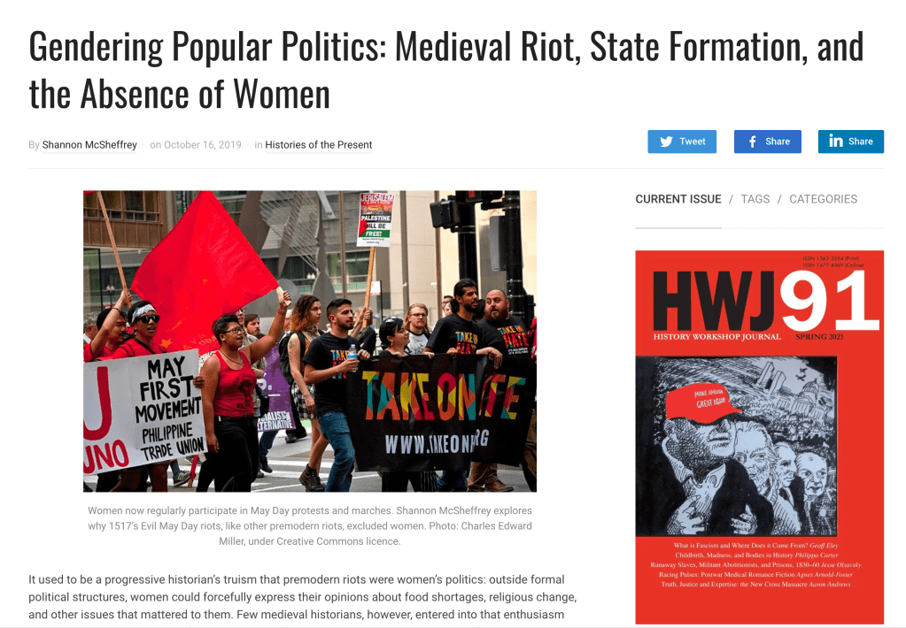 “Gendering Popular Politics: Medieval Riot, State Formation, and the Absence of Women,” History Workshop Online, 16 October 2019