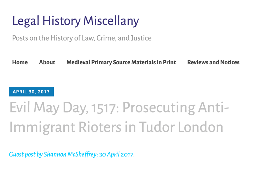 “Disorder, Riot, and Governance in Early Tudor London: Evil May Day, 1517,” paper presented to the Late Medieval Seminar, Institute of Historical Research, University of London, 5 Feb. 2021. On Youtube