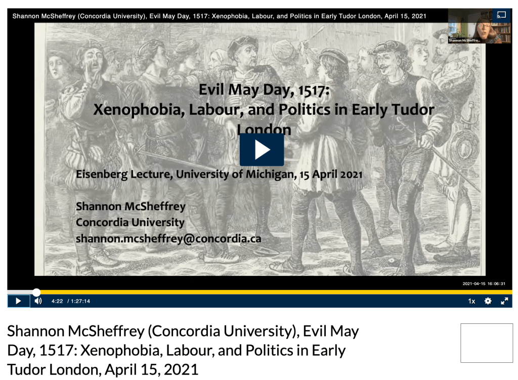 “Evil May Day, 1517: Xenophobia, Labour, & Politics in Early Tudor London,” Public Lecture, Eisenberg Institute for Historical Studies, University of Michigan, 15 April 2021 (via Zoom), recorded
